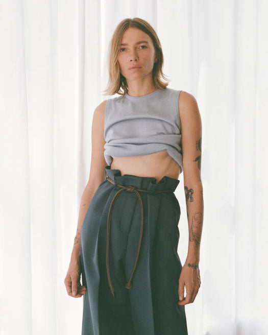 A rolled belt with circular finished ends. This style is finer and longer than the classic Knot belt and also drapes a bit more on the body. Multiple tying and styling variations possible. Great over a blazer, sweater or simply through your belt loops.