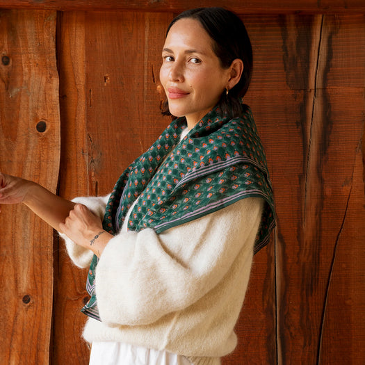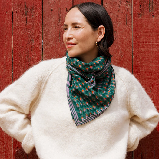 Mary Delany was a spirited 18thC artist and bluestocking known for her intricate botanical “paper mosiaks.” The Juniper Tulips square scarf, featuring cut-outs of long stemmed Tulips, is an ode to Mary who knew plants by their latin names.