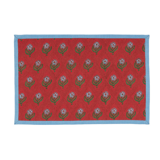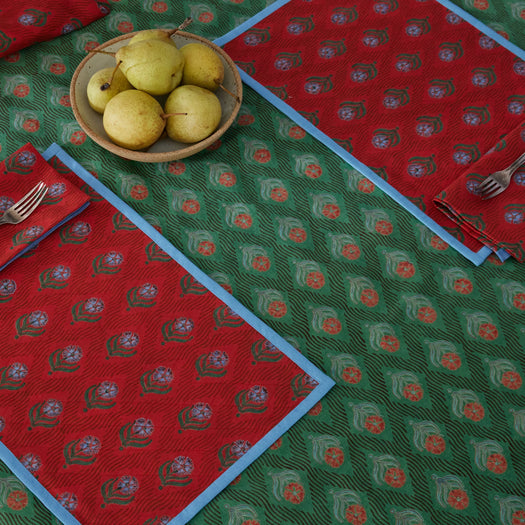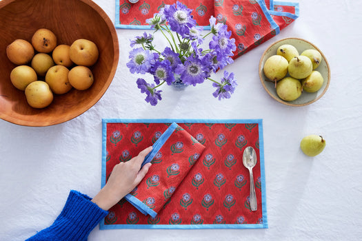 Please meet the pièce de résistance of your holiday table! The irresistible Carnations placemats are hand block printed, quilted, and reversible.