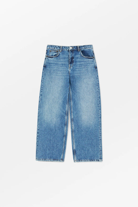 The cropped, straight leg and mid-waist jeans have a classic five pocket design and belt loops. On the back of the waistband, they feature an embroidered SKALL logo.