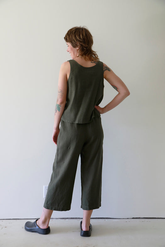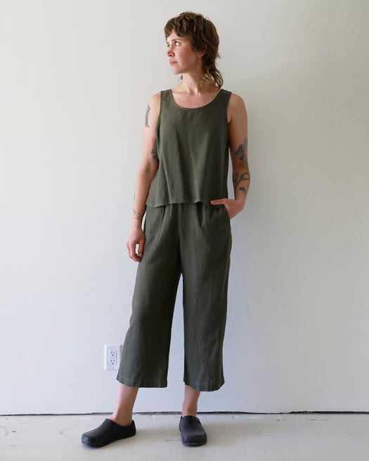 Lightweight linen blend pants with side pockets and an elastic waistband.