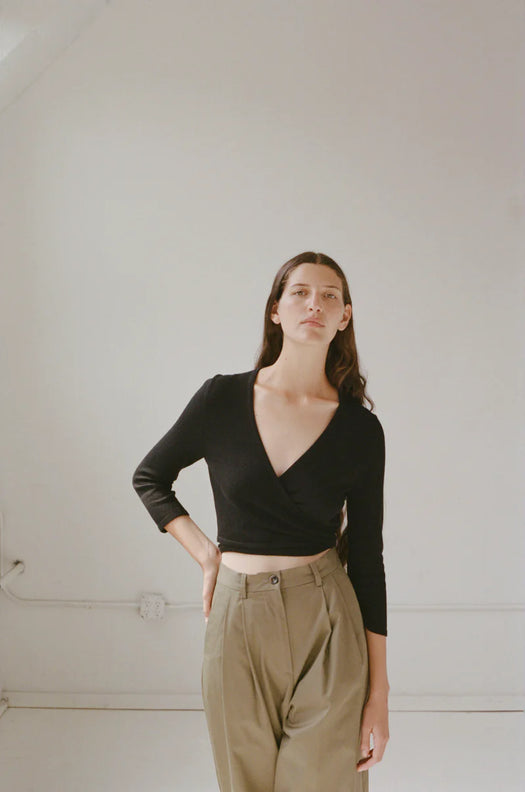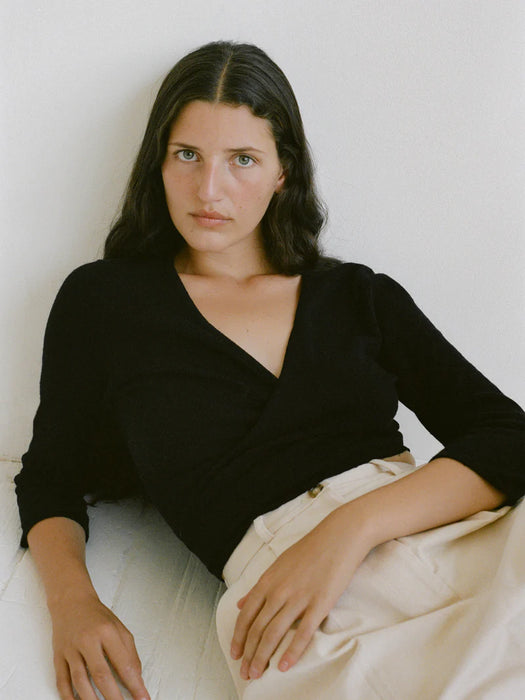 Universally flattering and effortless to wear, the Elsa Top is a wrapping top featuring a transitional alpaca and cotton yarn that is not sheer and has beautiful texture and breathability. The addition of the alpaca yarn, while being extremely soft and beautiful, transitions this top into the cooler months ahead. The Elsa Top features a dance wear inspired cut with ¾ length sleeves and an adjustable V neckline.