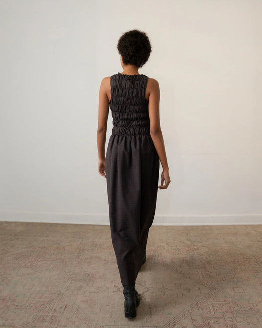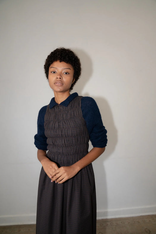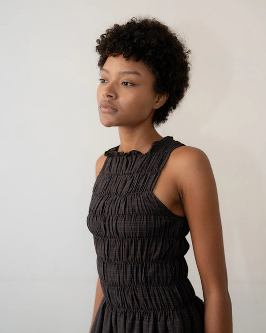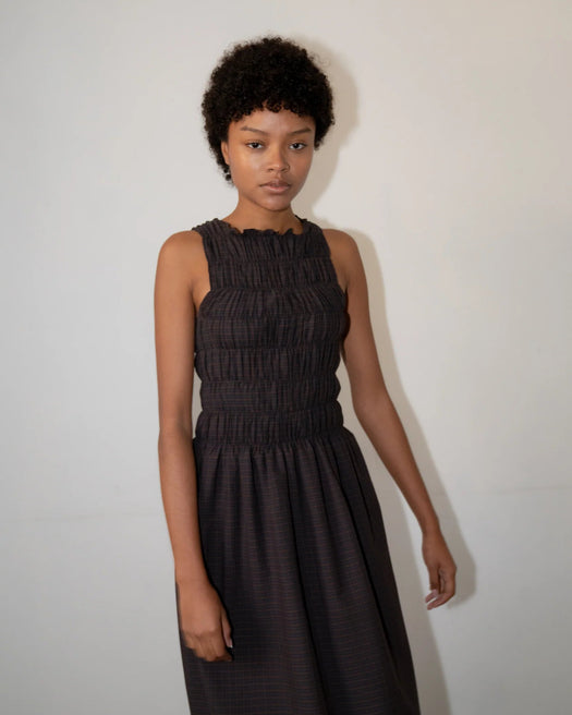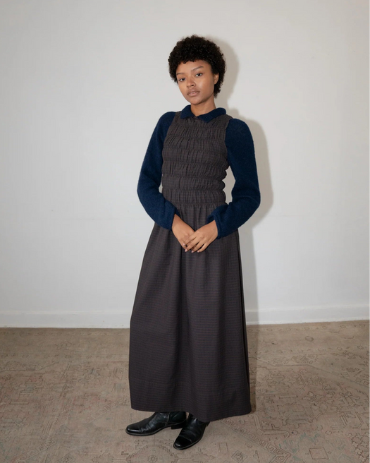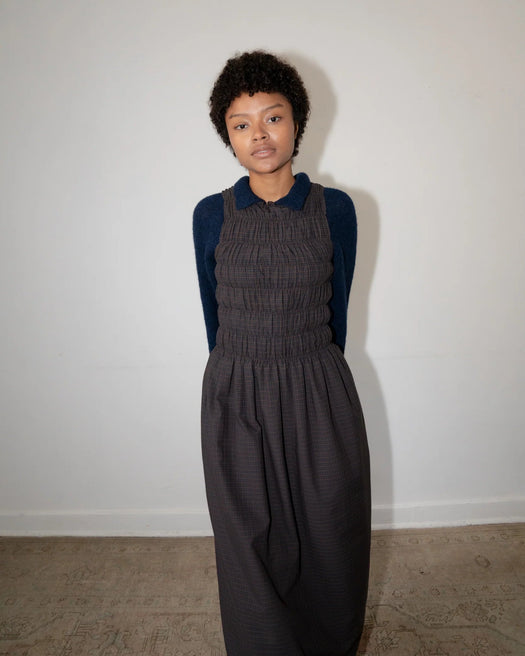 The Ila is cut from Japanese plaid cotton with dense smock detailing through the bodice. A gathered skirt falls to full length, creating volume against a structured top. A study in proportion and texture.