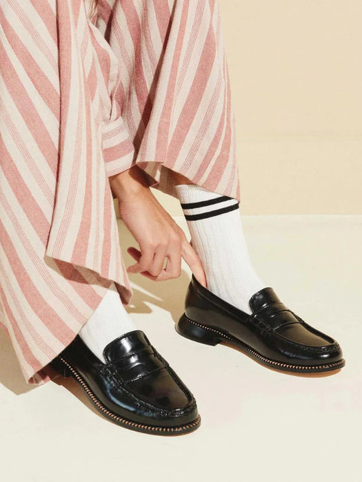 A modern take on a classic penny loafer. Handcrafted in a bold black spazzolato, the ELBA updates the timeless style with Freda Salvador's signature notched welt and angled leather heel. We’ll live in these loafers with everything from oversized suits, to cuffed jeans and socks to long skirts.