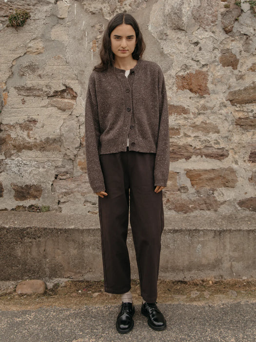 The Giséle Cardigan is a merino wool cardigan with a slightly boxy and cropped fit. Featuring a round neckline and corozo buttons.