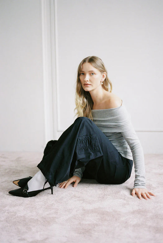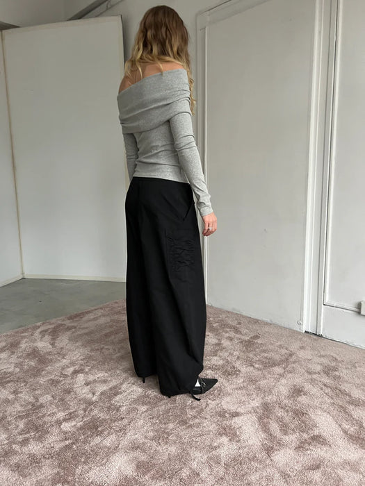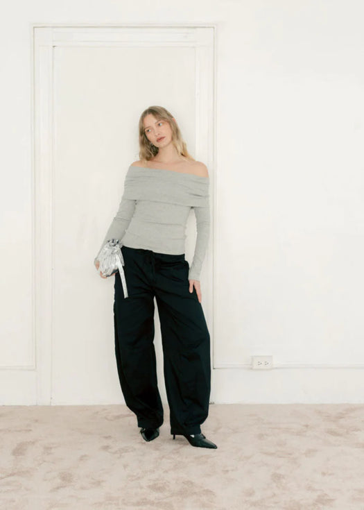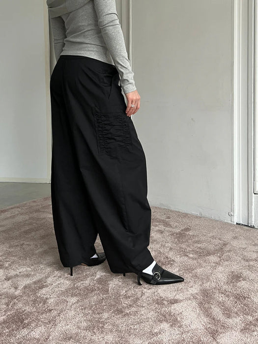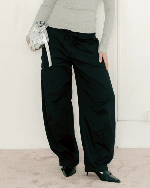Barrel leg trouser with a zipper fly with front tie detail at waistband. Ruffle-style side pockets. Low-mid rise. Knee darts for shape. Adjustable tie at bottom hemline.