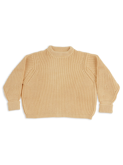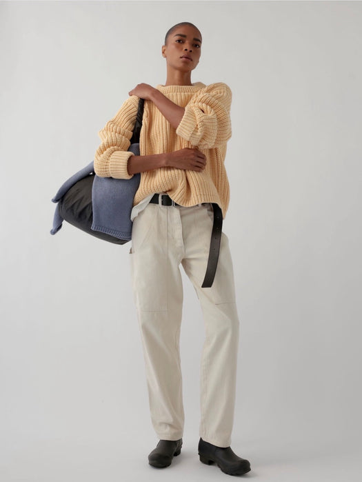 An oversized cotton pullover with a chunky fisherman ribbed stitch, exaggerated sleeves and a rolled cuff.