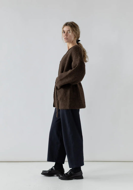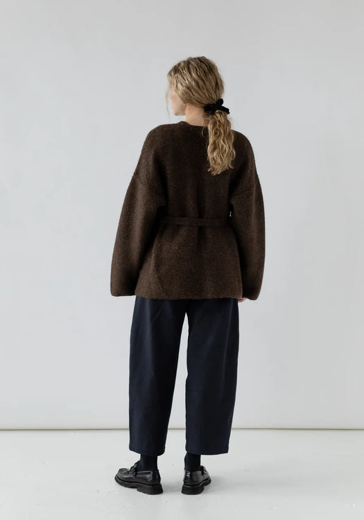 The beloved sweater coat is back this season in a felted baby alpaca. Styled with two waist level pockets and a belt with loops to keep it closed. The hand felted technique adds a beautiful soft and fuzzy texture that feels both elevated and casual.