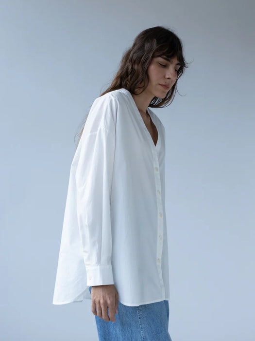 The Studio Shirt is an oversized button down blouse taking cues from our favorite menswear shirts. Featuring a clean finished V neck front with deep back pleat for a soft and beautiful silhouette. This crisp and softly structured shirt has a menswear inspired shirting hem and cuff with pleat and button.