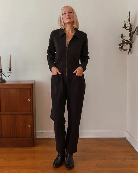 Noble's signature Utility Suit made from durbale yet buttery soft GOTS certified organic cotton canvas with a beautiful contrast stitch. Features a cropped leg and cinched waist.