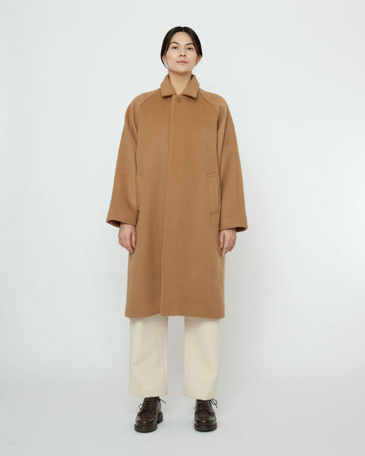 A classic mid-length wool overcoat. This is the wool version of 7115's Signature Duster Coat. Features a pointed collar, straight hem, concealed placket, raglan sleeves, and two front welt side pockets. Cut with a boxy fit.