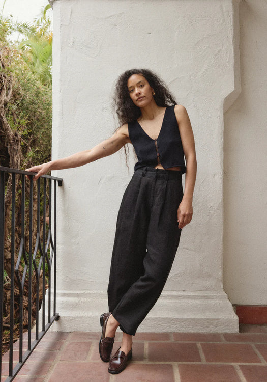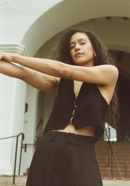 The Clio vest is designed with a slightly boxy and cropped fit to be worn on its own or as a layering piece over a tee or dress. Finished with loops and mother of pearl buttons down the center front with a peek of skin between each loop.
