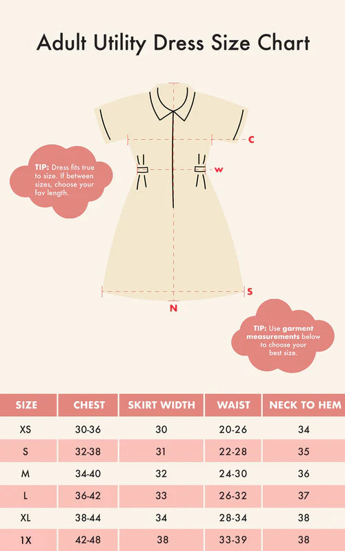 XL: Chest 38-44" Skirt Width, Waist 28-34", Neck to Hem 38"