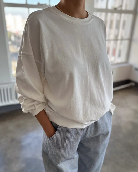 The Cali Jersey Sweatshirt is a playful take on the classic crewneck. Crafted from 100% premium cotton jersey, it offers the lightweight feel of the Little Boy Tee, making it ideal for layering under jackets. It also borrows signature details from the Poche Top, like a ribbed crew neckline and relaxed balloon sleeves. Designed with a slightly oversized fit, it features a perfectly cropped length, creating the perfect balance of style and comfort.