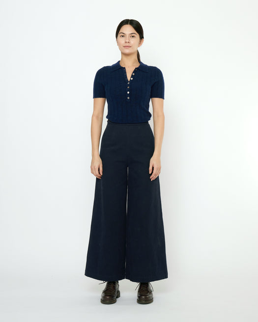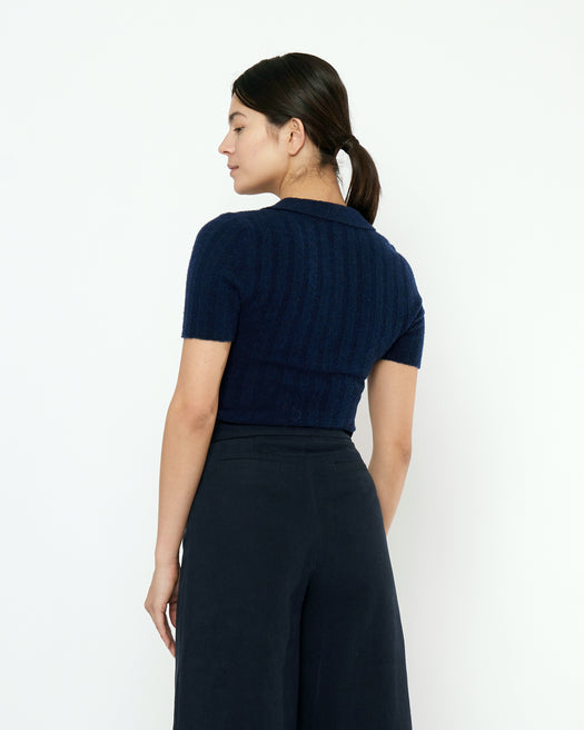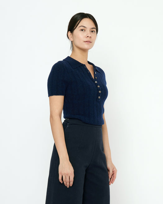 A lightweight ribbed knit tee that features a spread collar, button-up placket, half-length sleeves, and a snug fit.