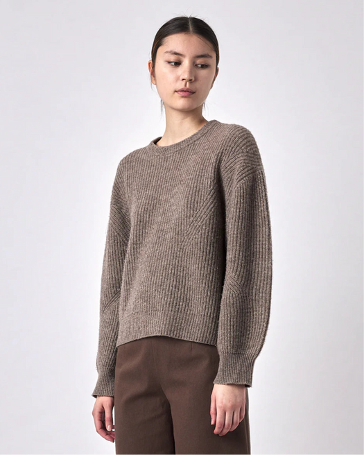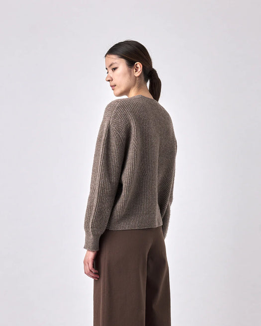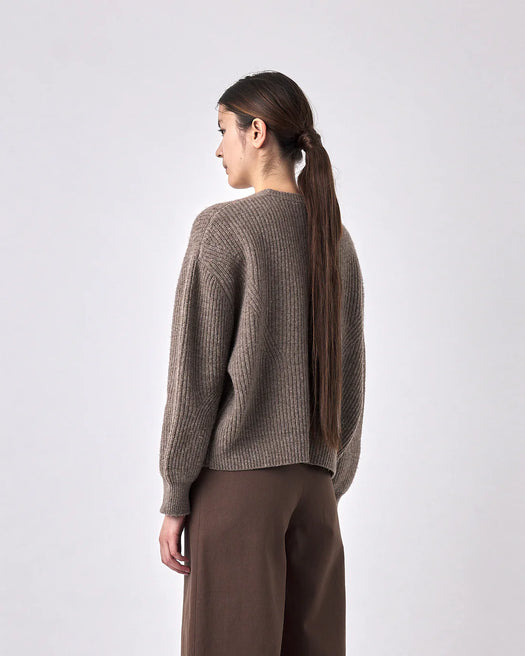 A sweater designed with a graceful shape and drape. Features elegant poet sleeves, ribbed cuffs, and a transfer rib pattern.