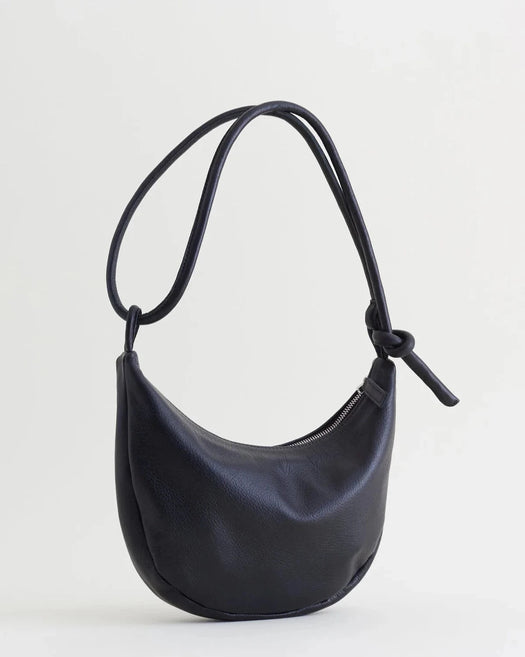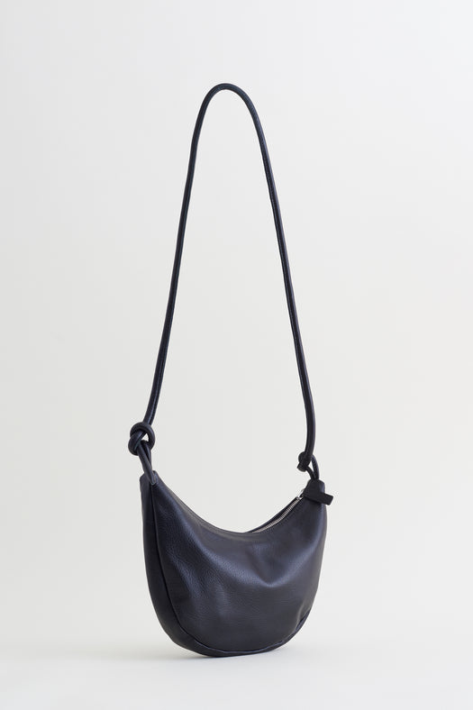 A soft form crescent shaped bag featuring one rolled strap with knotted end for adjustability and a zipper closure.
