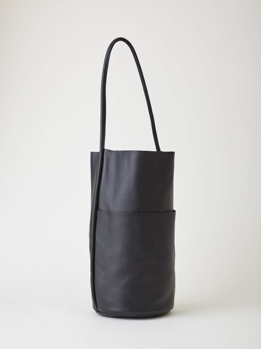 A best seller from Are Studio's Core Collection that has been with them since the beginning. A bucket style shoulder bag with a circular base and minimal look. One rolled handle is integrated into the side seams of the bag with one large exterior pocket. Unlined cowhide leather with raw edges.