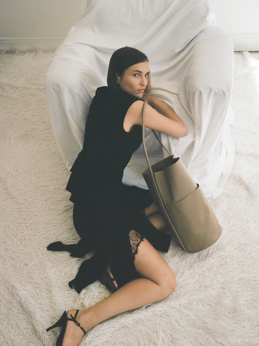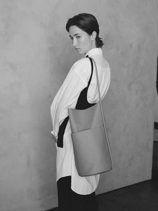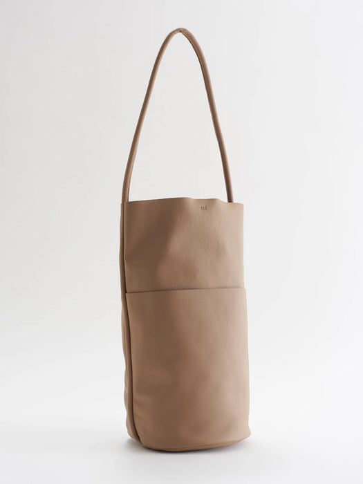 A best seller from Are Studio's Core Collection that has been with them since the beginning. A bucket style shoulder bag with a circular base and minimal look. One rolled handle is integrated into the side seams of the bag with one large exterior pocket. Unlined cowhide leather with raw edges.