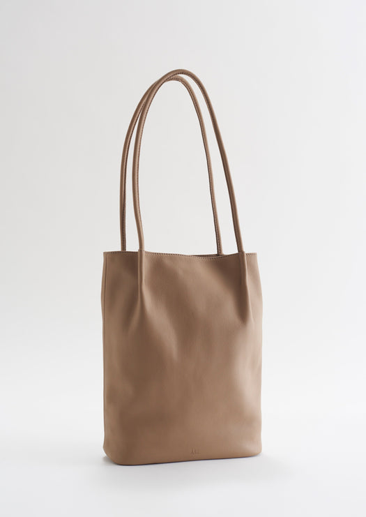 Soft form shoulder bag with 2 rolled shoulder straps pinched in the front and back sides of the bag.