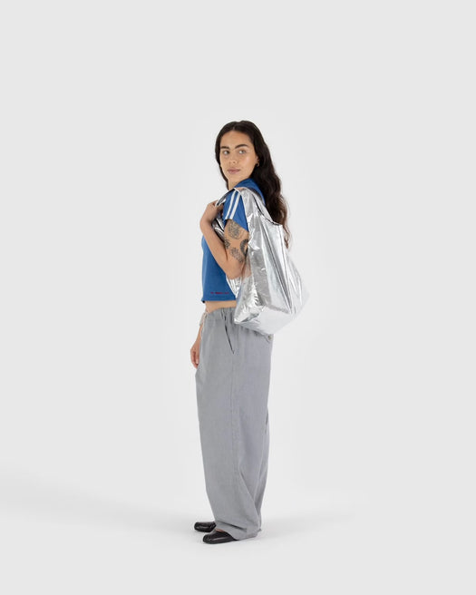 Carries 2-3 plastic grocery bags worth of stuff comfortably in hand or over your shoulder.