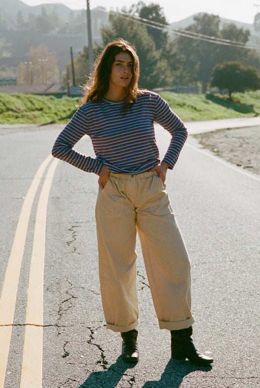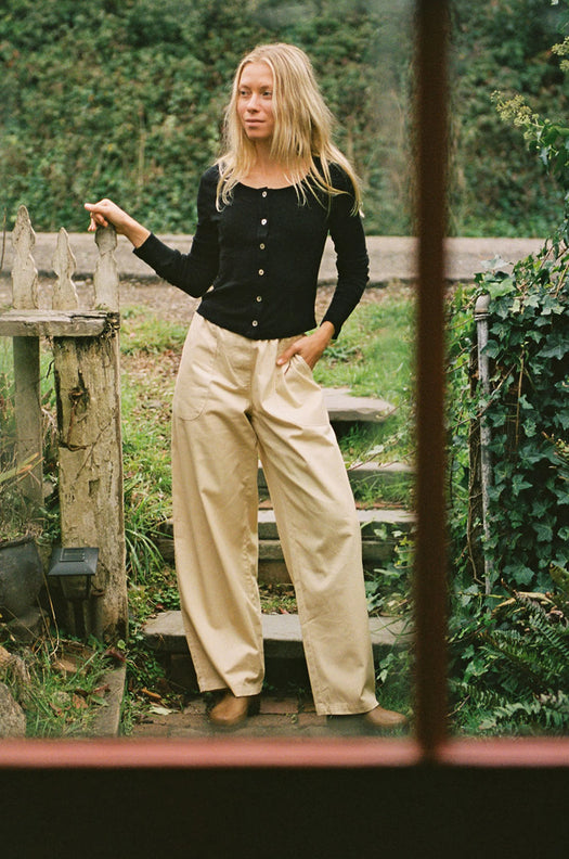 Inspired by the chinos in 90's catalogues, these ankle length twill pants feature a snap front elasticated waistband and straight unstructured leg. The medium weight twill has been garment dyed for a soft, broken-in finish.