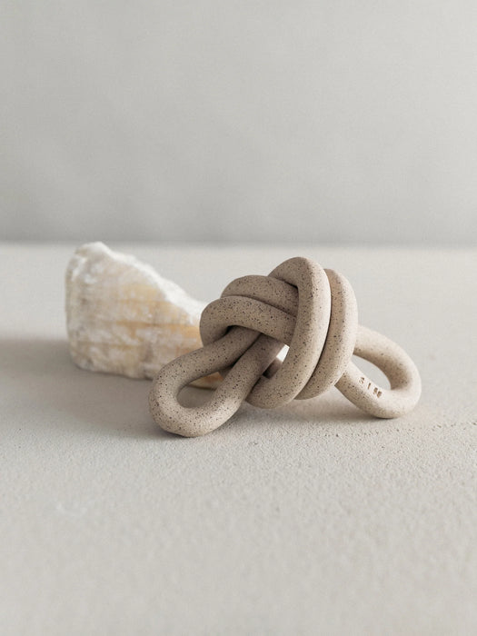 An ornamental double loop knot made out of clay and will serve you well on windy days when papers and napkins cannot be trusted to sit still. It’s also the perfect topper to a stack of books that demand to be adorned.