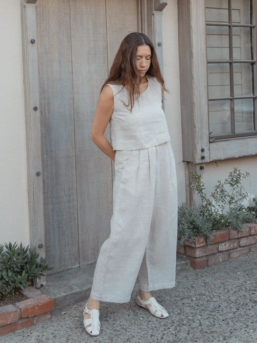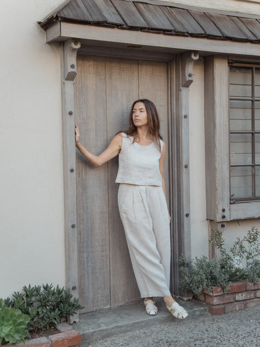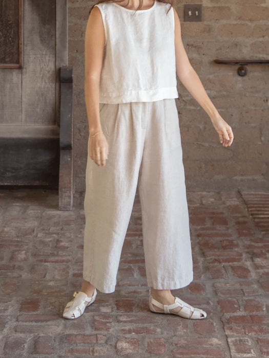 The Andy Trouser is our favourite new pant for spring and summer. They are a cropped, wide-leg, pleated pant, with a half elastic at the back. These are woven in a heavier weight linen which makes them feel wonderful to wear, and gives them a bit more structure to keep their shape.