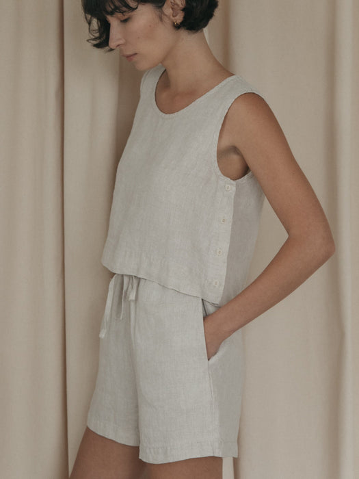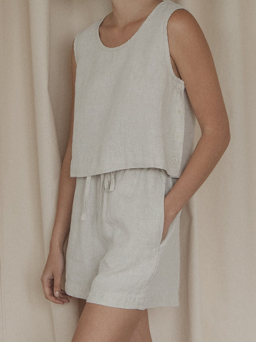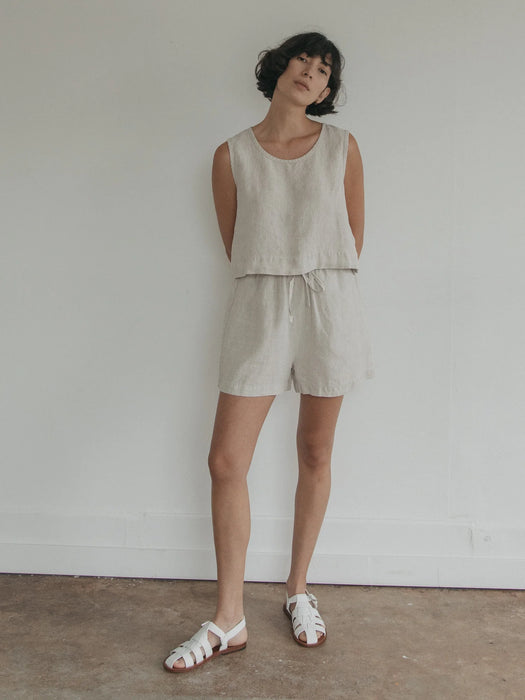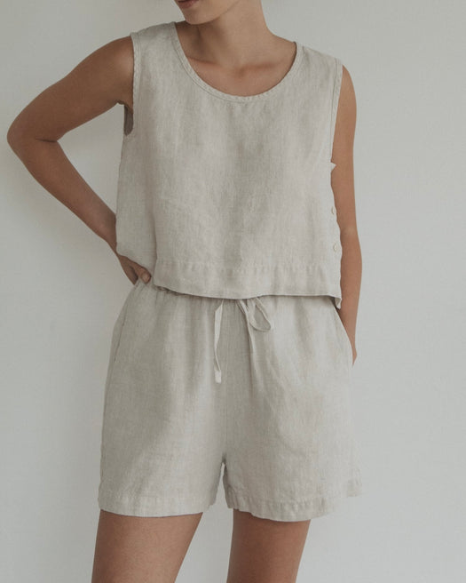 Easy summer shorts with a super comfy elastic drawstring waist, high rise, and side seam pockets. The ideal loose linen shorts, for the ultimate summer comfort.