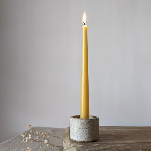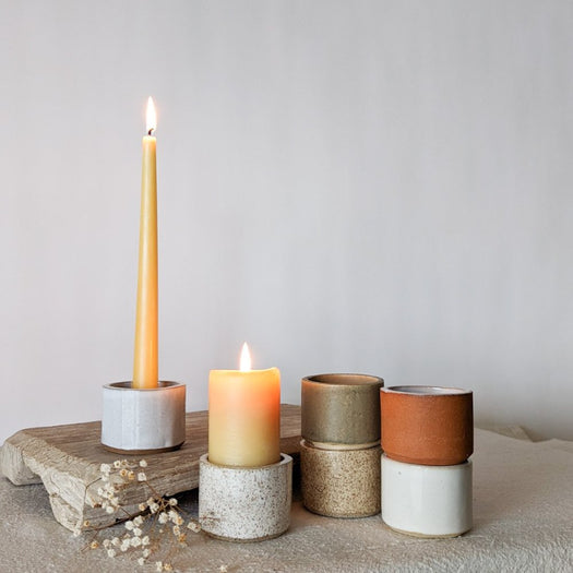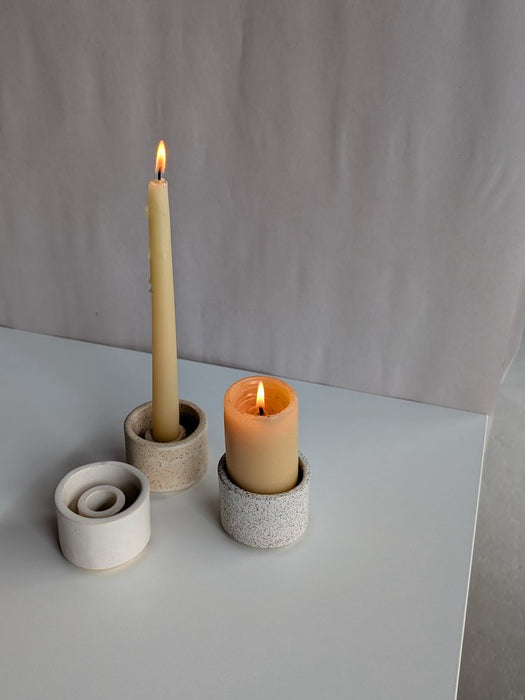 Simple candle holder for tapers. Can also hold a 2”D pillar. Inner ring inside holds the candle and makes it appear to float.
