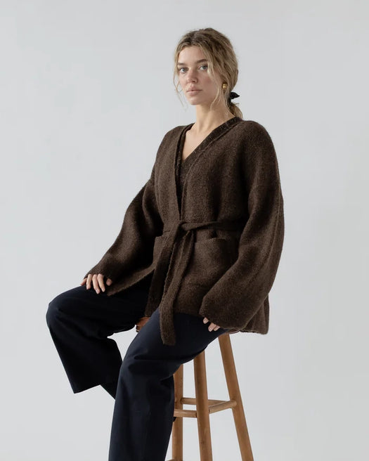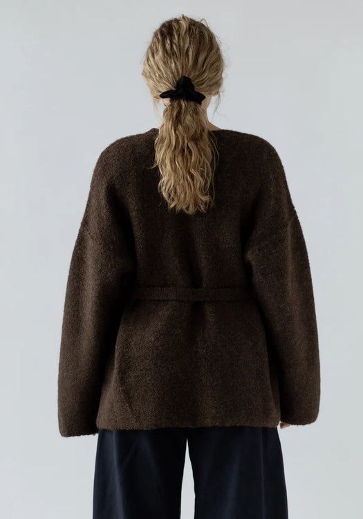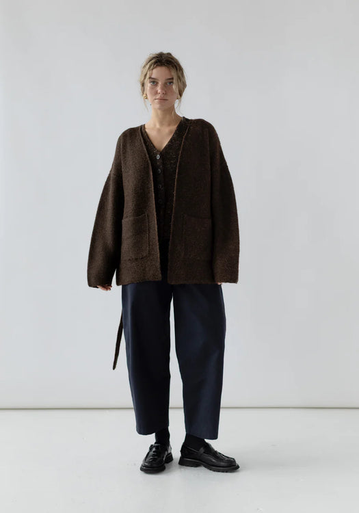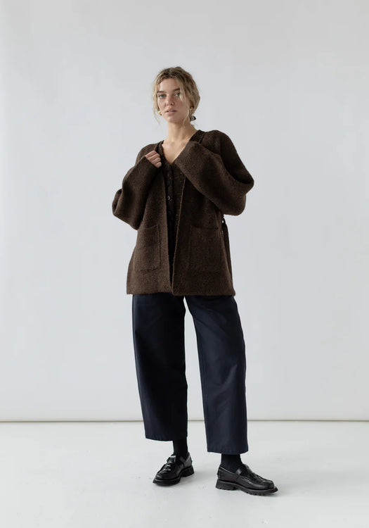 The beloved sweater coat is back this season in a felted baby alpaca. Styled with two waist level pockets and a belt with loops to keep it closed. The hand felted technique adds a beautiful soft and fuzzy texture that feels both elevated and casual.
