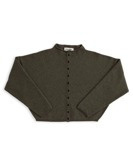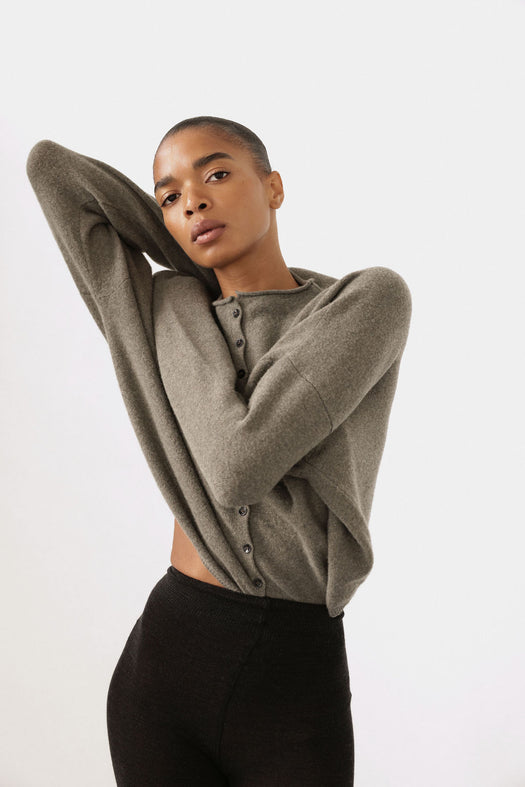 Cropped cardigan with wide dolman fit along shoulders and chest, tapered waist, ribbed trims, corozo button placket, and funnel neckline.