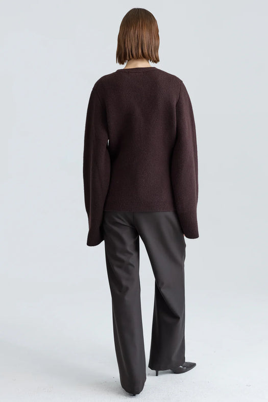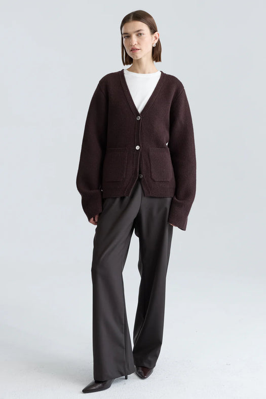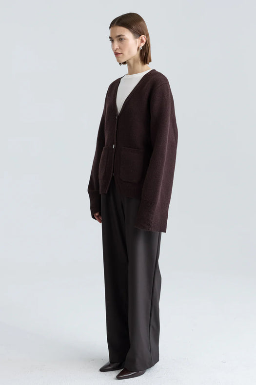 A mid to heavy weight wool cardigan with wide sleeves and a deep v neck. Front button closure and patch pockets for a chic look. It's like an outerwear piece for the transitional colder months.