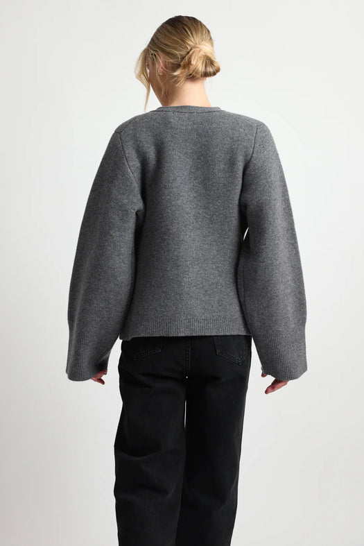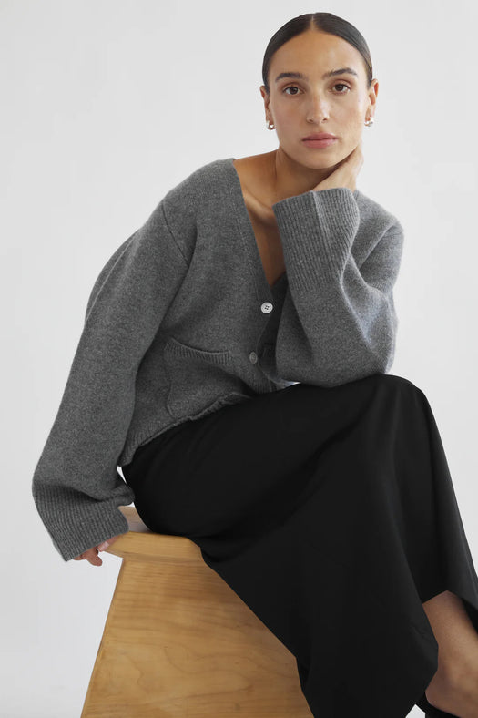 A mid to heavy weight wool cardigan with wide sleeves and a deep v neck. Front button closure and patch pockets for a chic look. It's like an outerwear piece for the transitional colder months.