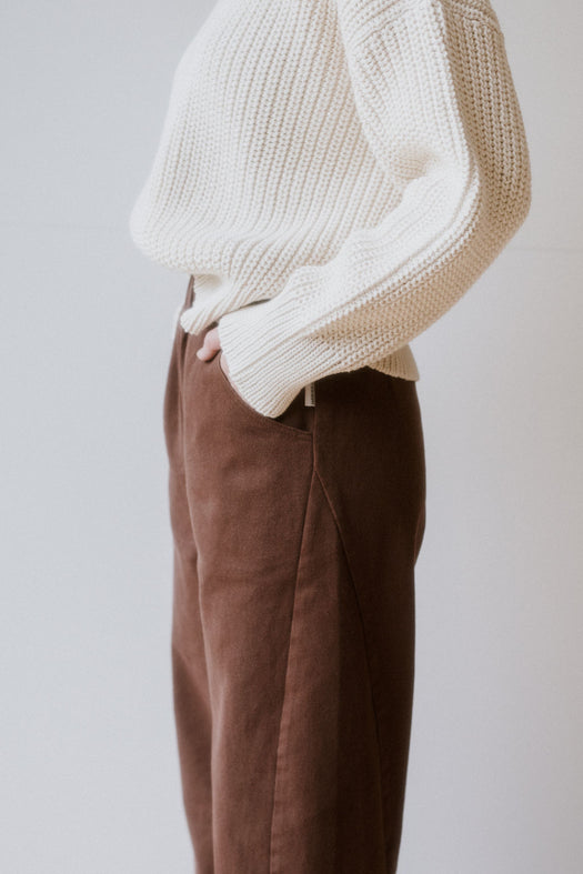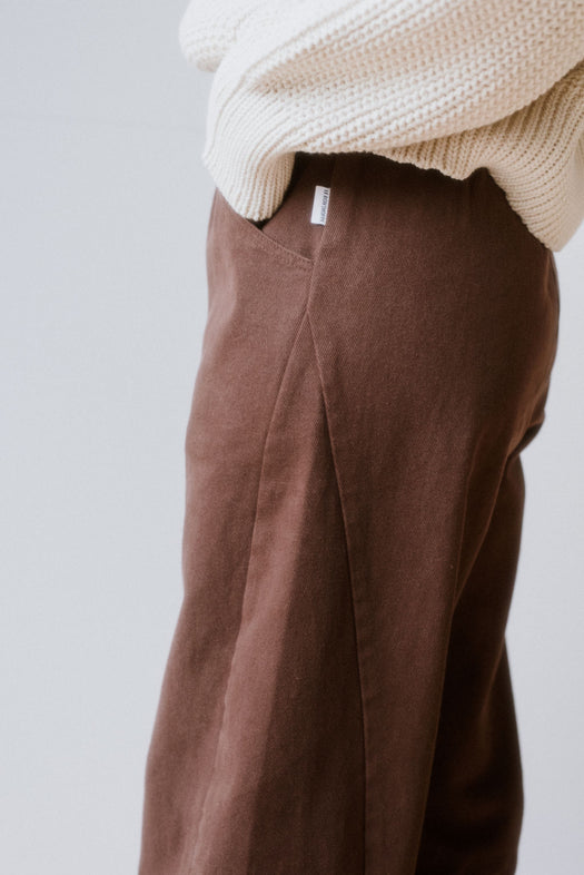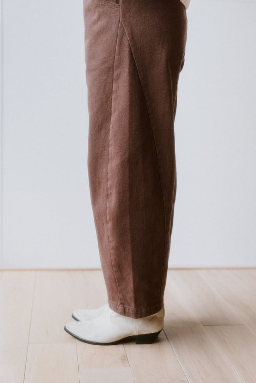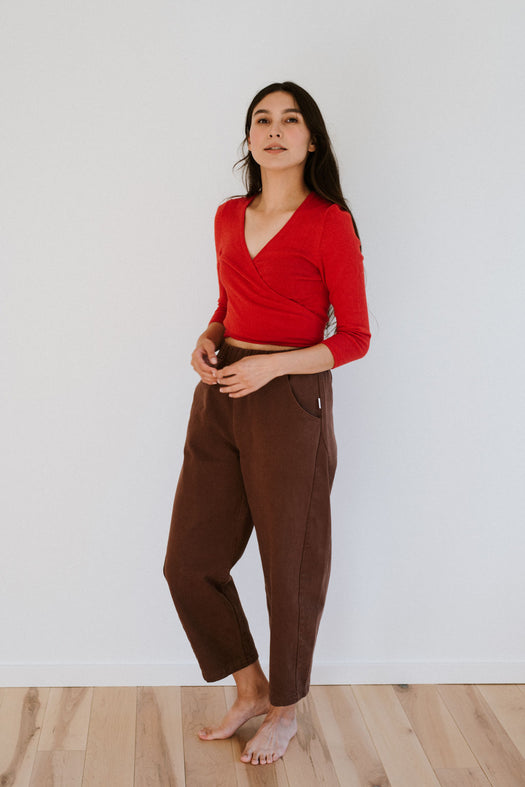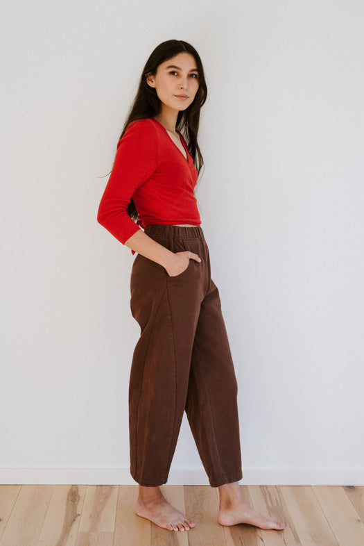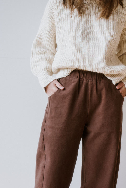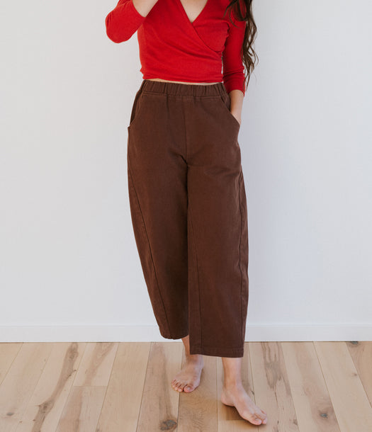 These are the pants we love to live in! Feature an elastic high waist that gives you room to breath, slightly curved leg shape, cropped length to show off your favorite socks and shoes, unique side panels and deep pockets. The heavy-weight canvas material adds durability and gives them a structured look.