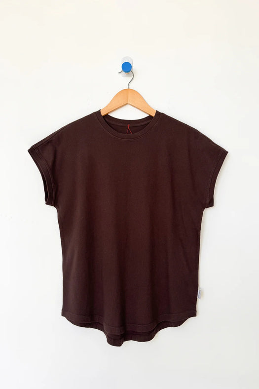 Ease Tee is an edgy dolman tee. It features a high crew neck, shoulder coverage without a sleeve, slightly rounded hem and a contrast rib banded sleeve opening and neck opening.