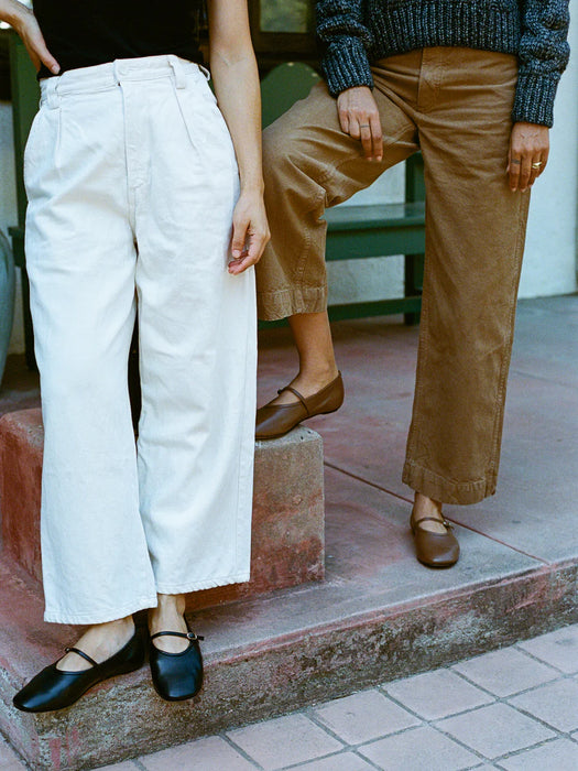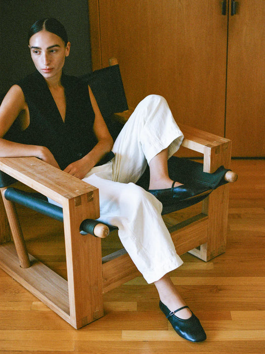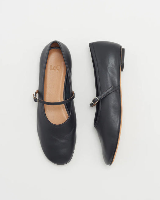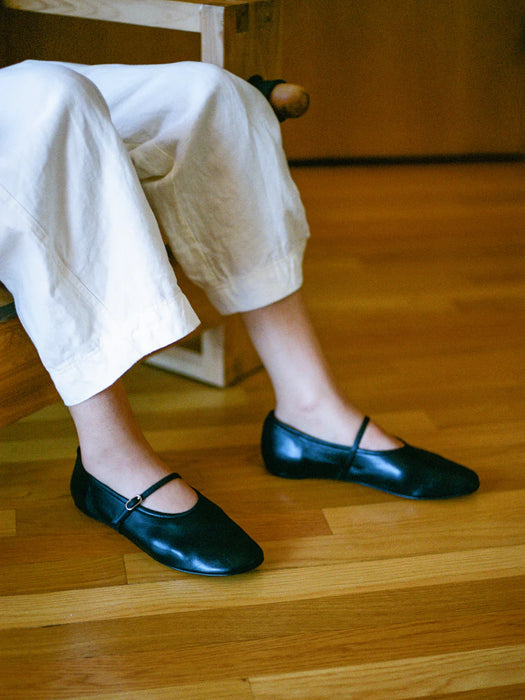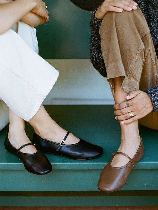 The Daria is a modern flat Mary Jane featuring a classic silver buckle with an updated round heel.
