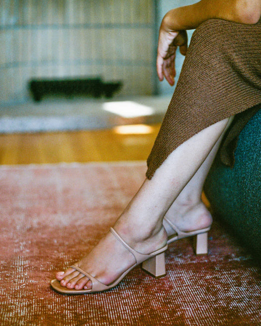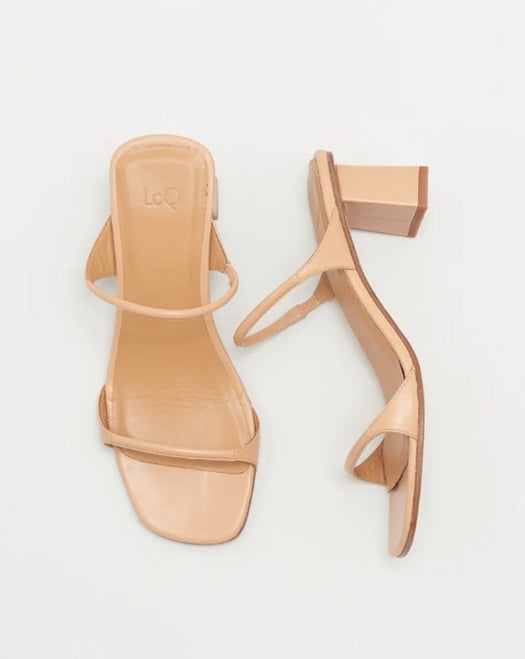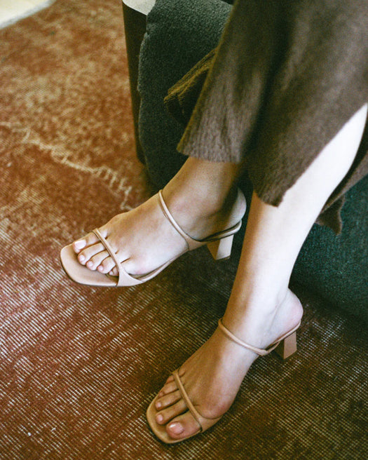 The Gael is a heeled slip on sandal with thin elegant tubular straps and a block heel in smooth black leather.