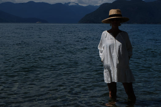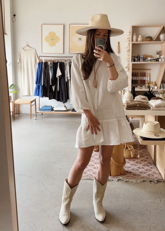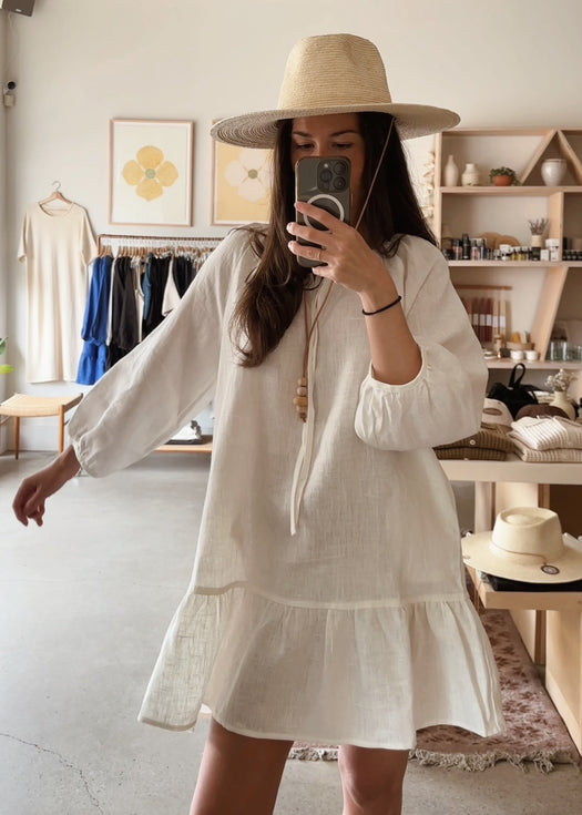 Classic peasant dress best suited for frolicking in meadows or playing at the beach. Features side pockets and front tie to bow or leave relaxed.