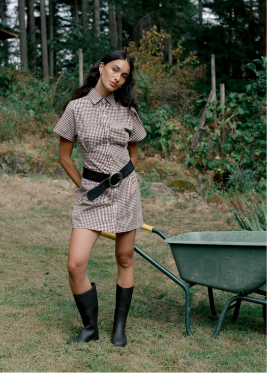 Short sleeve button down mini dress with darts at waist and back for a fitted look.