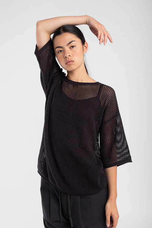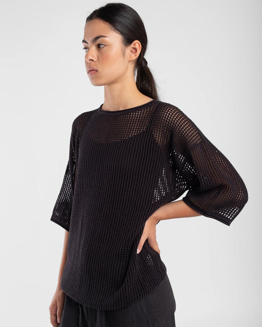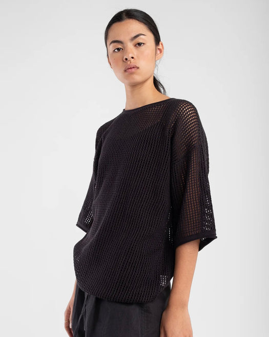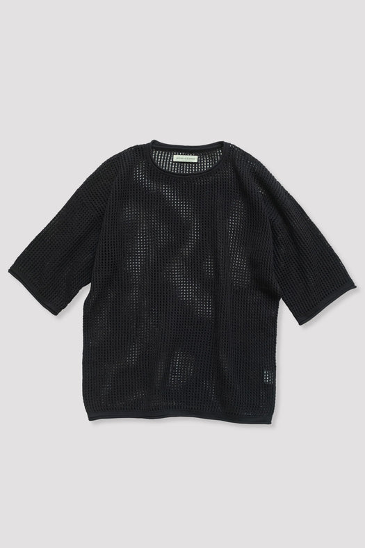 Mesh style tee featuring a distinctive open weave pattern. The fit is relaxed with a longer length and sleeves.
