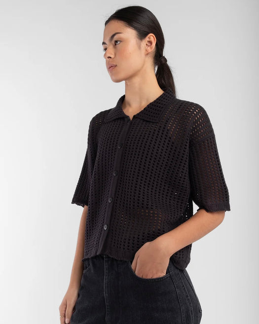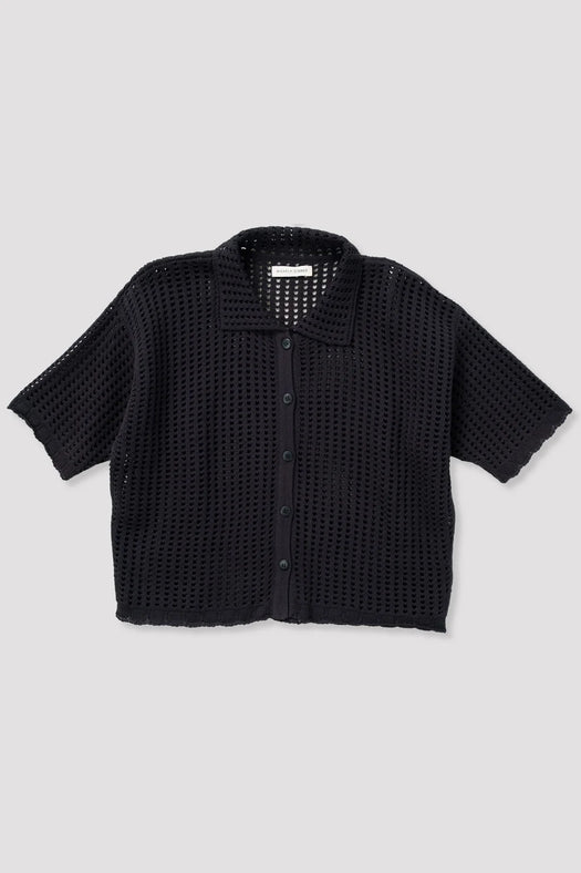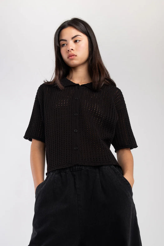 Open knit cotton short sleeve cardigan with relaxed fit. Petite scallop hem detail at bottom and sleeve. Button front. A super versatile spring piece.