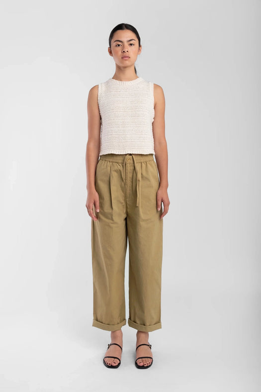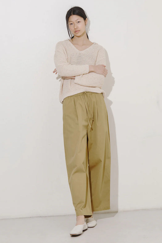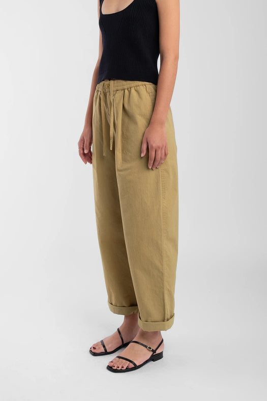 Lightweight pleated trouser with tie waist in a washed cotton. Featuring button front with zip fly and exposed waistband tie. The silhouette is baggy with a slightly tapered leg.