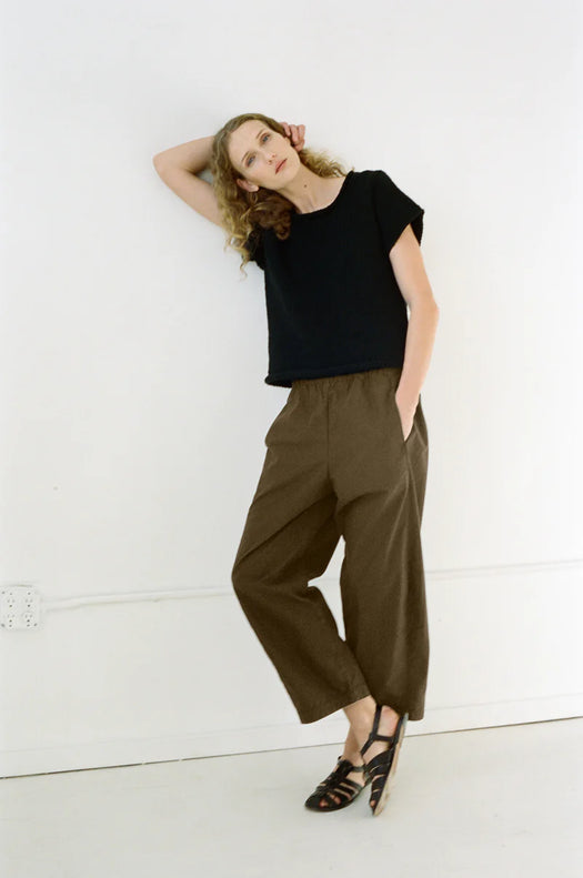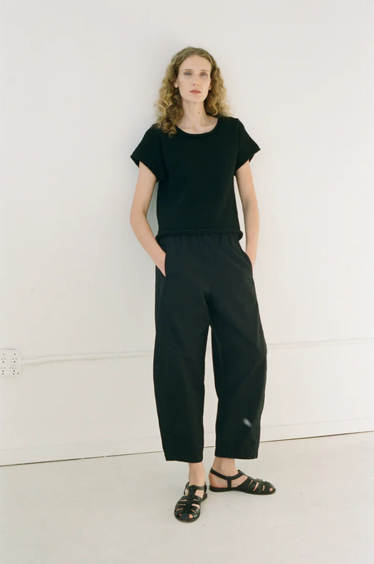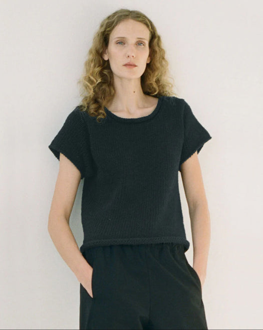 A chunky, hand knit cotton tee with wabi sabi texture that adds interest and ease to any look. Taking cues from the boxy shape and textured yarn of Shaina Mote's best selling Brisa Top, the Artesia Top has a relaxed short sleeve, roll hem and neckline. For year round wear.