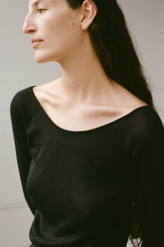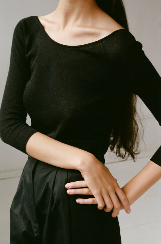 A soft base layer tee with romantic ballet neckline and scooped back. Features three quarter length sleeves and a fitted yet easy cut. Made in a lightweight cotton blend.