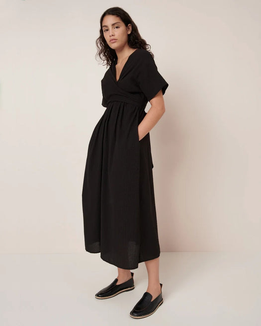 The Composer Dress is defined by its wrap front detail, creating a flattering v-neckline. Crafted from a textural organic cotton seersucker, it features a standard fit with subtle shaping through the back bodice and inseam pockets for effortless functionality.