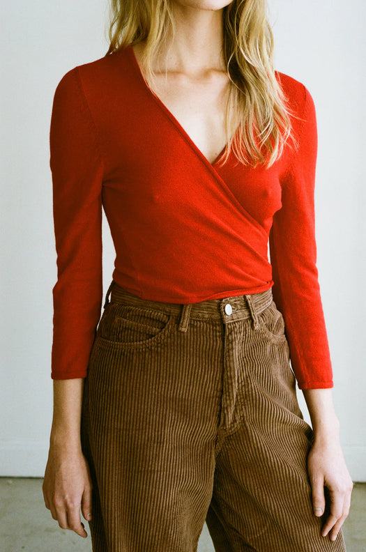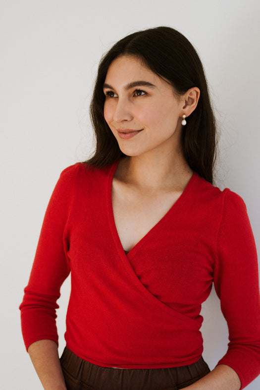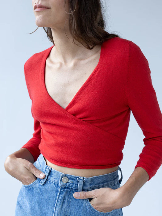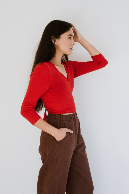 Universally flattering and effortless to wear, the Elsa Top is a wrapping top featuring a transitional alpaca and cotton yarn that is not sheer and has beautiful texture and breathability. The addition of the alpaca yarn, while being extremely soft and beautiful, transitions this top into the cooler months ahead. The Elsa Top features a dance wear inspired cut with ¾ length sleeves and an adjustable V neckline.