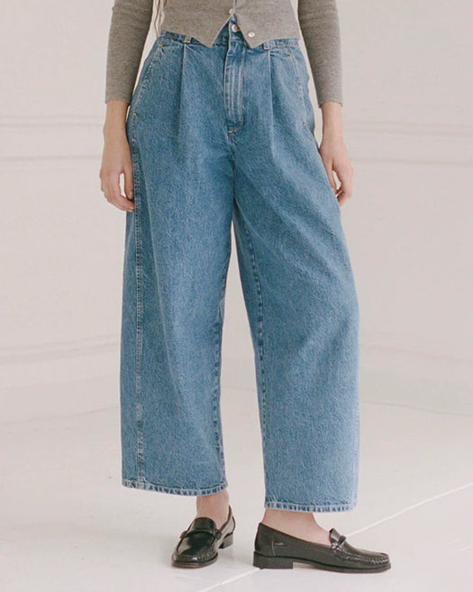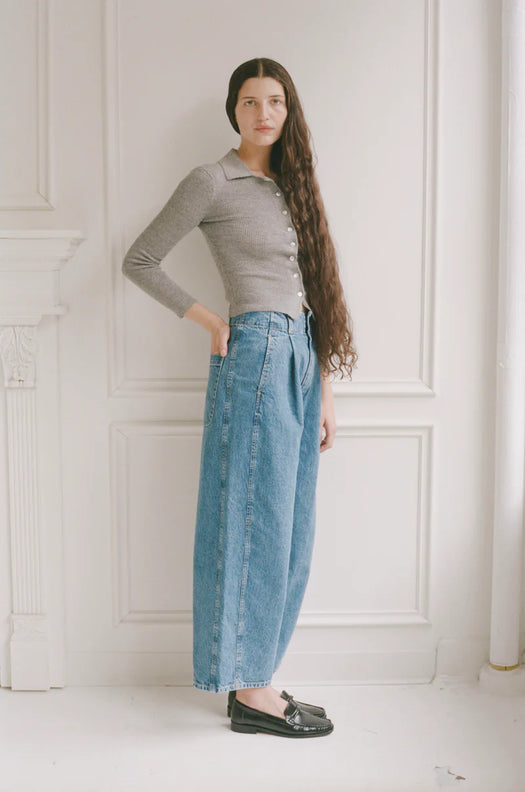 A relaxed cut, high waist trouser with single front pleat, grazing at ankle length. Features set in side panel along outer seam and back patch pockets. An easy, subtle balloon shape leg, inspired by the Boy Trouser.