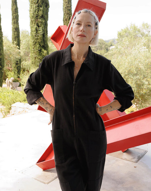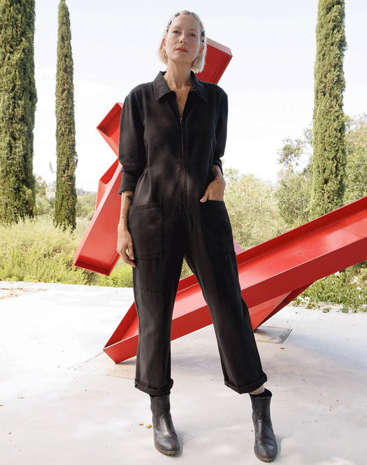 Noble's signature Utility Suit made from durbale yet buttery soft GOTS certified organic cotton canvas with a beautiful contrast stitch. Features a cropped leg and cinched waist.