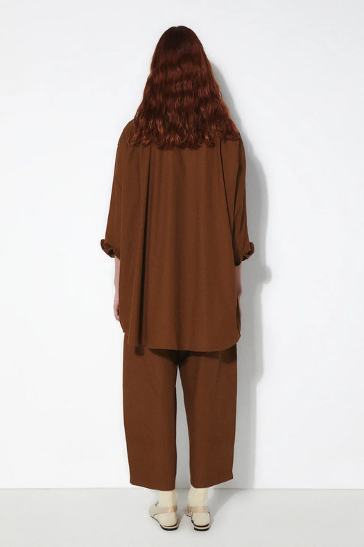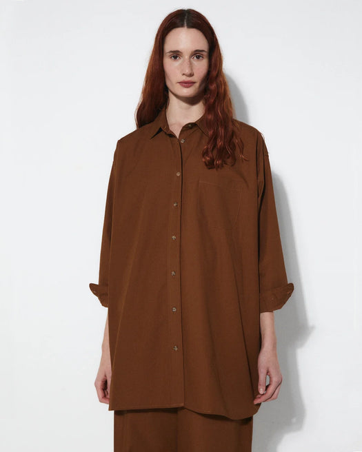 Cotton poplin oversize shirt with a mandarin collar and classic placket. Features long puffed sleeves and adjustable button cuffs.